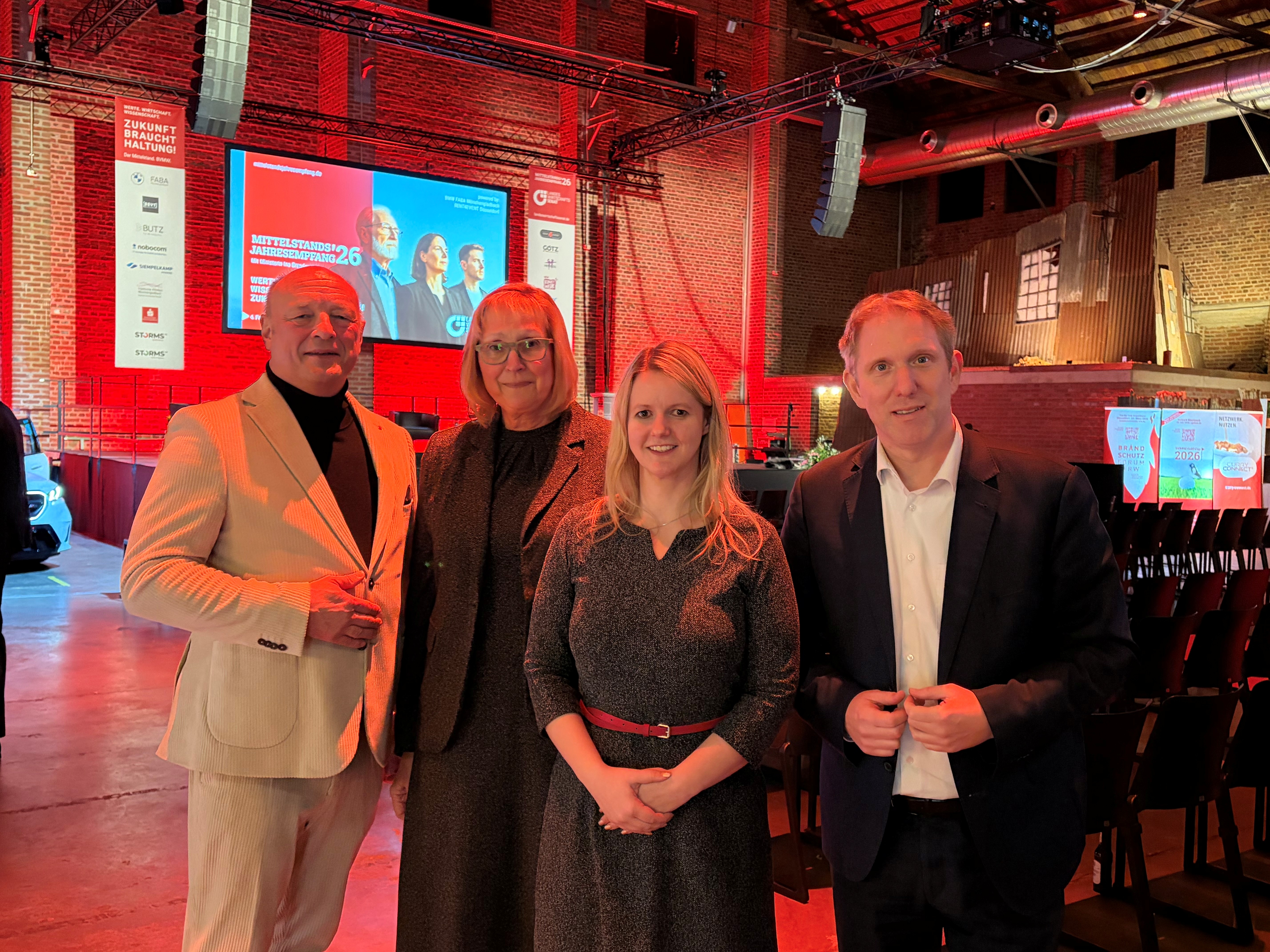 NRW-Wissenschaftsministerin Ina Brandes hat den Mittelstandsempfang des BVMW in Mönchengladbach besucht. Organisator Stefan Wagemanns freute sich über viele Vertreter der Wirtschaft aus Mönchengladbach, Düsseldorf und der Region - und über den MIT-Vorsitzenden Dr. Matthias Johnen, die stellvertretende Ratsfraktionsvorsitzende Marion Gutsche und die beiden Landtagsabgeordneten Vanessa Odermatt und Jochen Klenner als Gäste im Kunstwerk Wickrath.